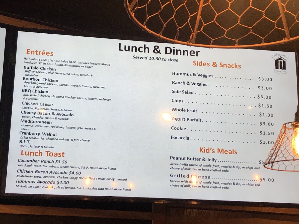 The cafe also boasts a variety of ala carte breakfast items, including fresh Sourdough Toast and refreshing Fruit and Yogurt Parfaits. For a light touch, enjoy wholesome side items such as Hummus and Veggies or their crispy Focaccia, perfect for pairing with your cup of their renowned organic Fair Trade coffee.